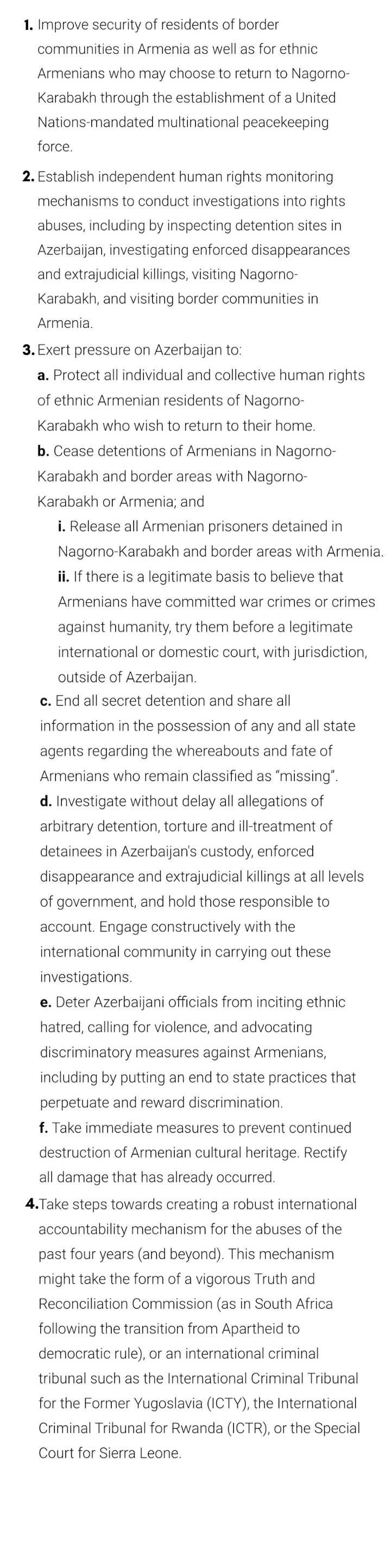 Despite the repeated warnings that we and others issued, the international community failed to take measures necessary to prevent ethnic cleansing in Nagorno-Karabakh. In light of this, it is urgent that measures be taken now to protect those still at risk, ensure investigation and accountability for the crimes committed in the recent past, and to prevent further abuses in the region and beyond. There are opportunities for the international community today to uphold human rights, but they will close if action is not taken quickly: